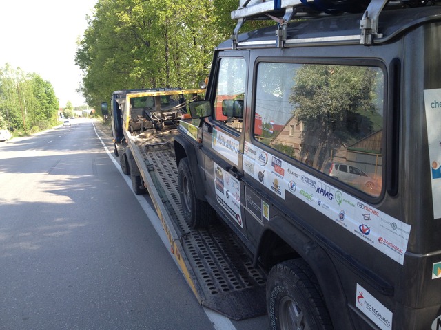 De technishe problemen beperken zich niet alleen tot team 11 (de TD van Jos en Gerrie). De auto van team 15 (Guus en Guus-Jan) werd tijdelijk op Russisch kenteken gezet om op een Russische militaire basis een nieuwe voorruit te laten snijden; van de Mercedes van team 6 (Koert-Jan en Horace) brak de wielophanging, team 7 (René en Michel) moest de koppakking vervangen maar team 12 (Eef en Paul) lijkt probleemloos door te gaan. Volg alle teams op www.hbc2012.nl