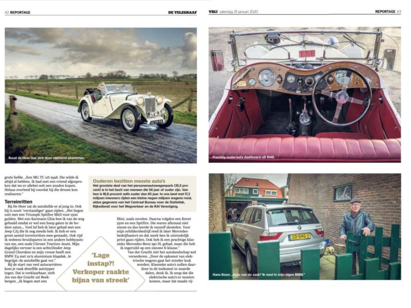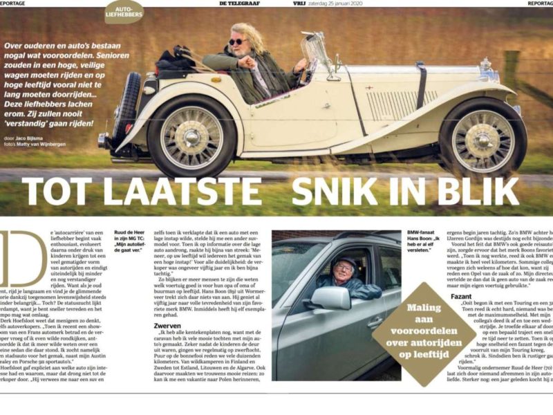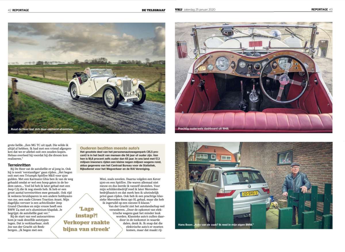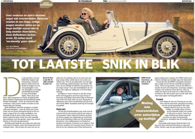 MGTTO-lid Ruud de Heer liet ons weten dat zijn MG TC zou verschijnen in een artikel over “ouderen en autorijden”. Dat artikel verscheen vandaag in de bijlage van de Telegraaf en MGTTO zou MGTTO niet zijn als we daar geen aandacht aan zouden besteden. De voorkant van de bijlage heeft u ook hierboven al kunnen zien. De tekst en de overige foto’s voegen we daarbij. U vindt die hieronder.